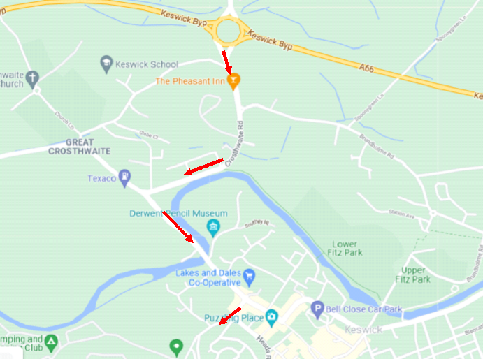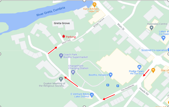 From the A66, take the exit to Keswick A5271 at the Crosthwaite Roundabout (Crosthwaite Road). At the junction turn left onto High Hill. Continue straight on to Main Street crossing the bridge over the river Greta. At the mini roundabout by the Co-op, turn right. Take the first right by Booths onto The Headlands. Take another first right onto Elliot Park and follow the road around to the right. The parking space for 6 Greta Grove can be found to the left.